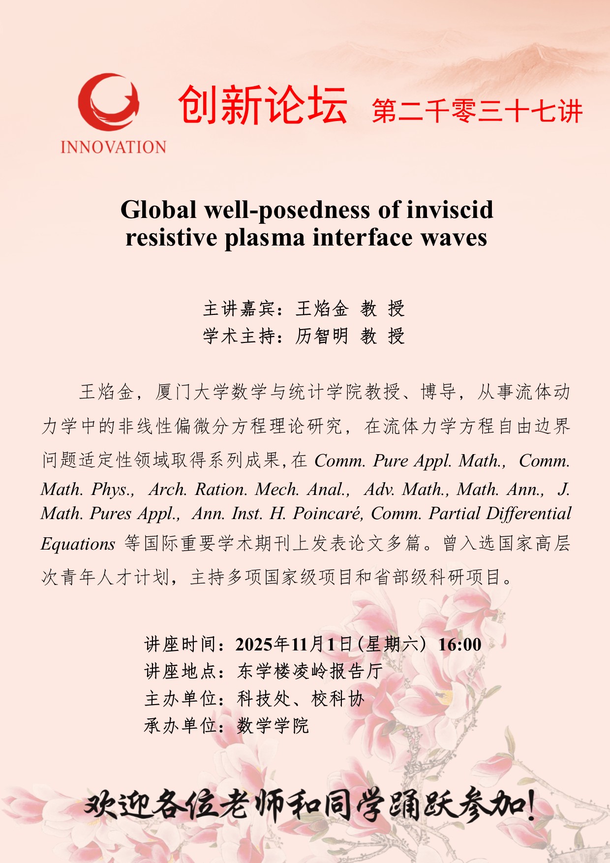 王焰金 教 授 乐竞体育电竞(中国)股份有限公司官网创新论坛第二千零三十七讲:Global well-posedness of inviscid resistive plasma interface waves 讲座时间 2025年11月1日(星期六) 16:00 讲座地点 东学楼凌岭报告厅 讲座人介绍 王焰金 教 授 讲座内容
