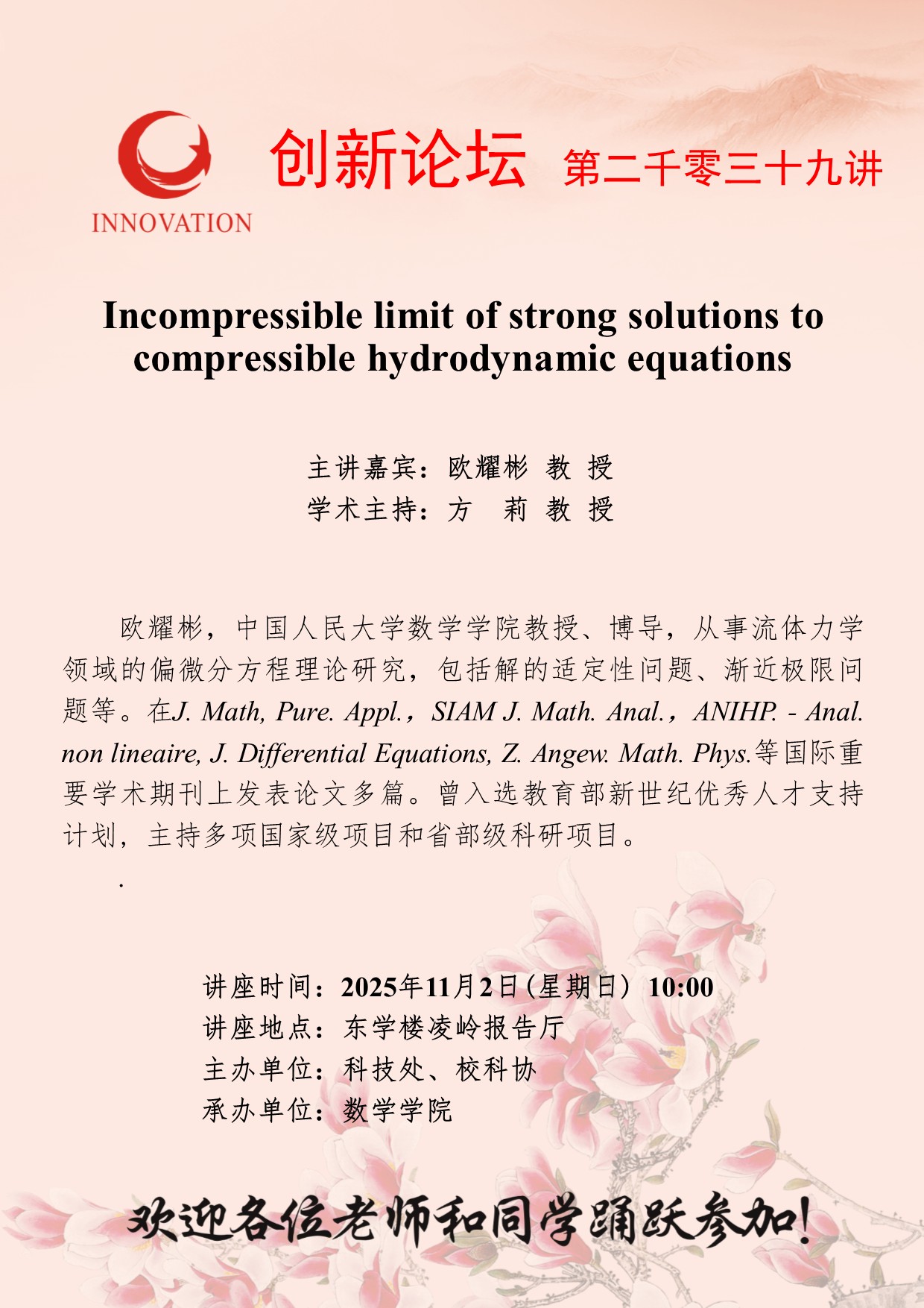 欧耀彬 教 授 乐竞体育电竞(中国)股份有限公司官网创新论坛第二千零三十九讲:Incompressible limit of strong solutions to compressible hydrodynamic equations 讲座时间 2025年11月2日(星期日) 10:00 讲座地点 东学楼凌岭报告厅 讲座人介绍 欧耀彬 教 授 讲座内容