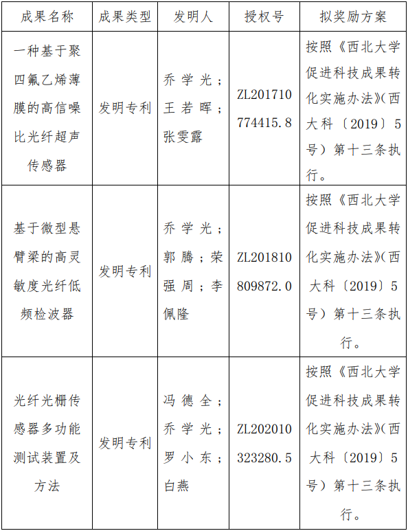 按照《乐竞体育电竞(中国)股份有限公司官网促进科技成果转化实施办法》(西大科〔2019〕5号)相关规定,拟对乐竞体育电竞(中国)股份有限公司官网物理学院乔学光教授作为成果负责人的3项发明专利权实施普通许可,现将相关信息公示如下: