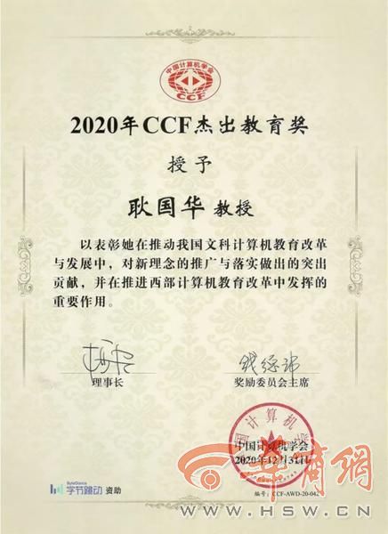 2020年中国计算机学会(CCF)颁奖典礼上,耿国华获得杰出教育奖。颁奖词这样评价,“耿国华教授在推动我国文科计算机教育改革与发展中,对新理念的推广与落实作出了突出贡献,并在推进西部计算机教育改革中发挥了重要作用,成果突出,影响广泛。”耿国华成为CCF杰出教育奖自2012年设立以来的首位女性获奖者。