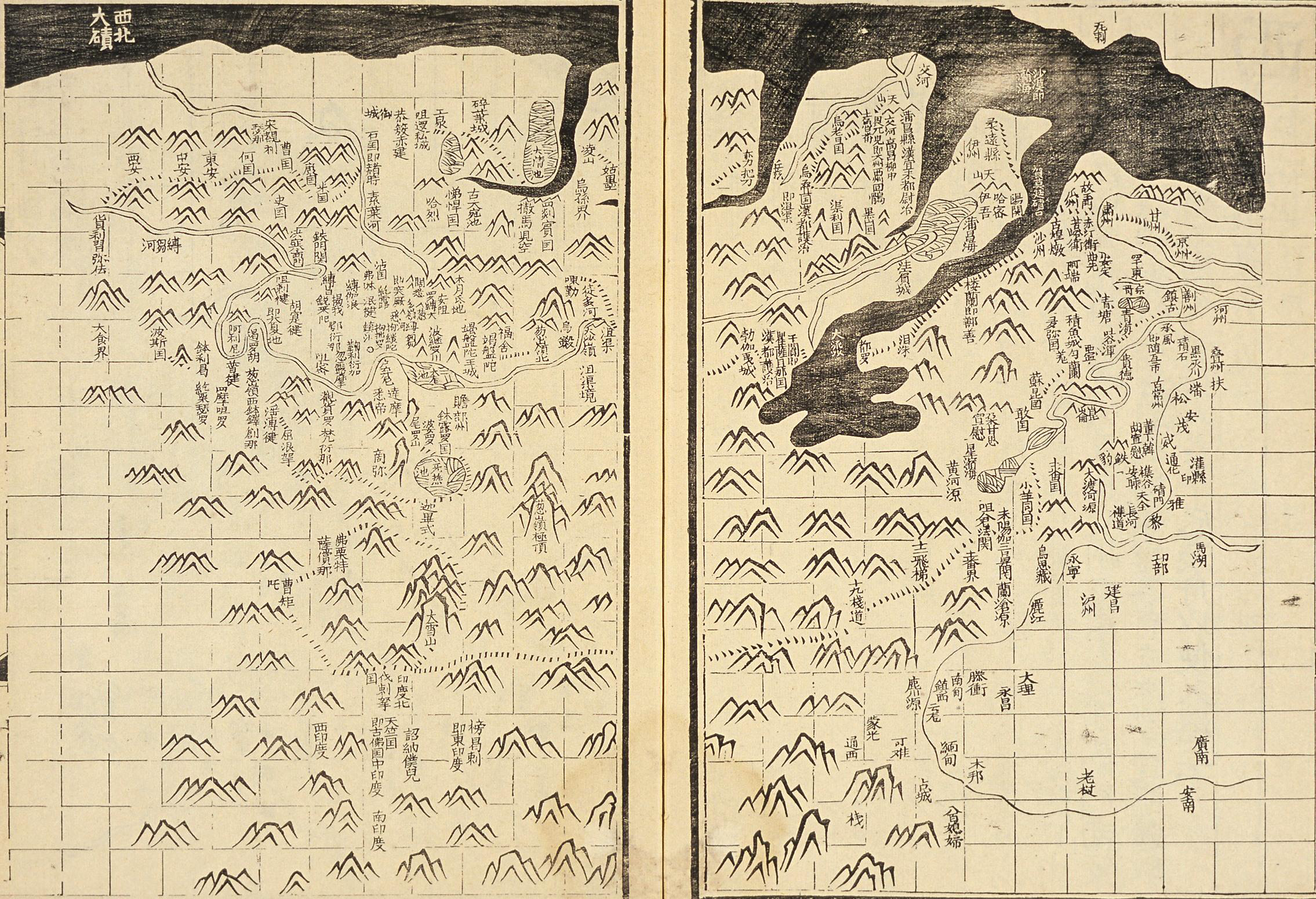 元代时,波斯地理学家扎马鲁丁等人将阿拉伯地图和制图技术传入中原,推动中文天下地图从“华夷图”演变为“混一图”,涵盖范围扩大到欧洲和非洲。《经世大典地理图》作为元代西域地理的集大成者,附于《经世大典》之中,详细绘制了新疆、中亚、西亚直至北非和东欧的辽阔疆域和丝路名城重镇。