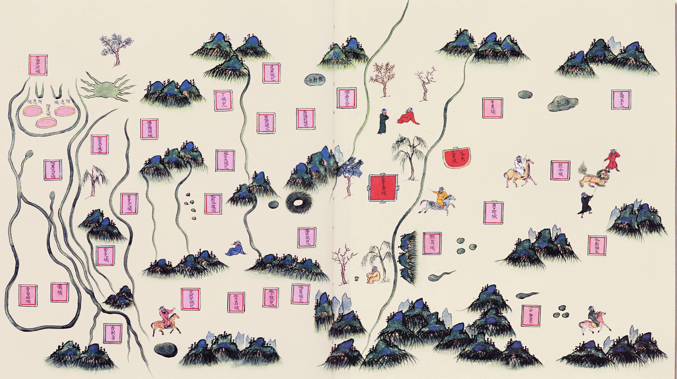明代《广舆图》与《皇明职方图》等地图集中都有专门的《西域图》,图中系统标注西域地区的汉唐古地名,印证了中原与西域悠久的交流交往历史。永乐年间明朝使臣陈诚所绘《西域行程图》及嘉靖时期陕西边臣绘制的《西域土地人物图》系列地图,生动记录了明代丝绸之路现实景观。其中《西域土地人物图》以甘肃嘉峪关至鲁迷(奥斯曼帝国都城,今土耳其伊斯坦布尔)之间丝路为框架,系统描绘了丝路沿线三百余处地点的山川、城镇、物产及族群、风俗,堪称十六世纪陆上丝绸之路的全景实录。现存三个明代彩绘本丝路地图分别收藏于台北故宫博物院、意大利地理学会和北京故宫,另有两套刻本收录于嘉靖二十一年《陕西通志》与万历四十四年《陕西四镇图说》。
