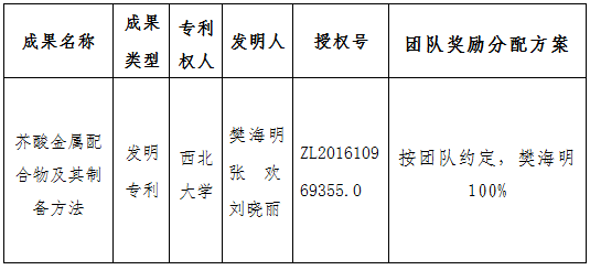 按照《乐竞体育电竞(中国)股份有限公司官网促进科技成果转化实施办法》(西大科〔2019〕5号)相关规定,经科技成果转化工作小组审议,校长办公会审定通过,拟对乐竞体育电竞(中国)股份有限公司官网化学与材料科学学院樊海明教授作为成果负责人的1项发明专利权实施以作价入股结合现金支付方式转让,现将相关信息公示如下: