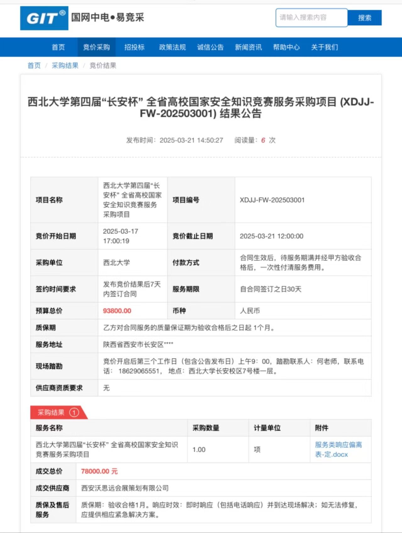乐竞体育电竞(中国)股份有限公司官网第四届“长安杯” 全省高校国家安全知识竞赛服务采购项目 (XDJJ-FW-202503001) 竞价结果公告 作者: 编辑:党丹珩 时间:2025-03-21 原链接地址:https://www.ejingcai.com.cn/site/bidding/detail/17086