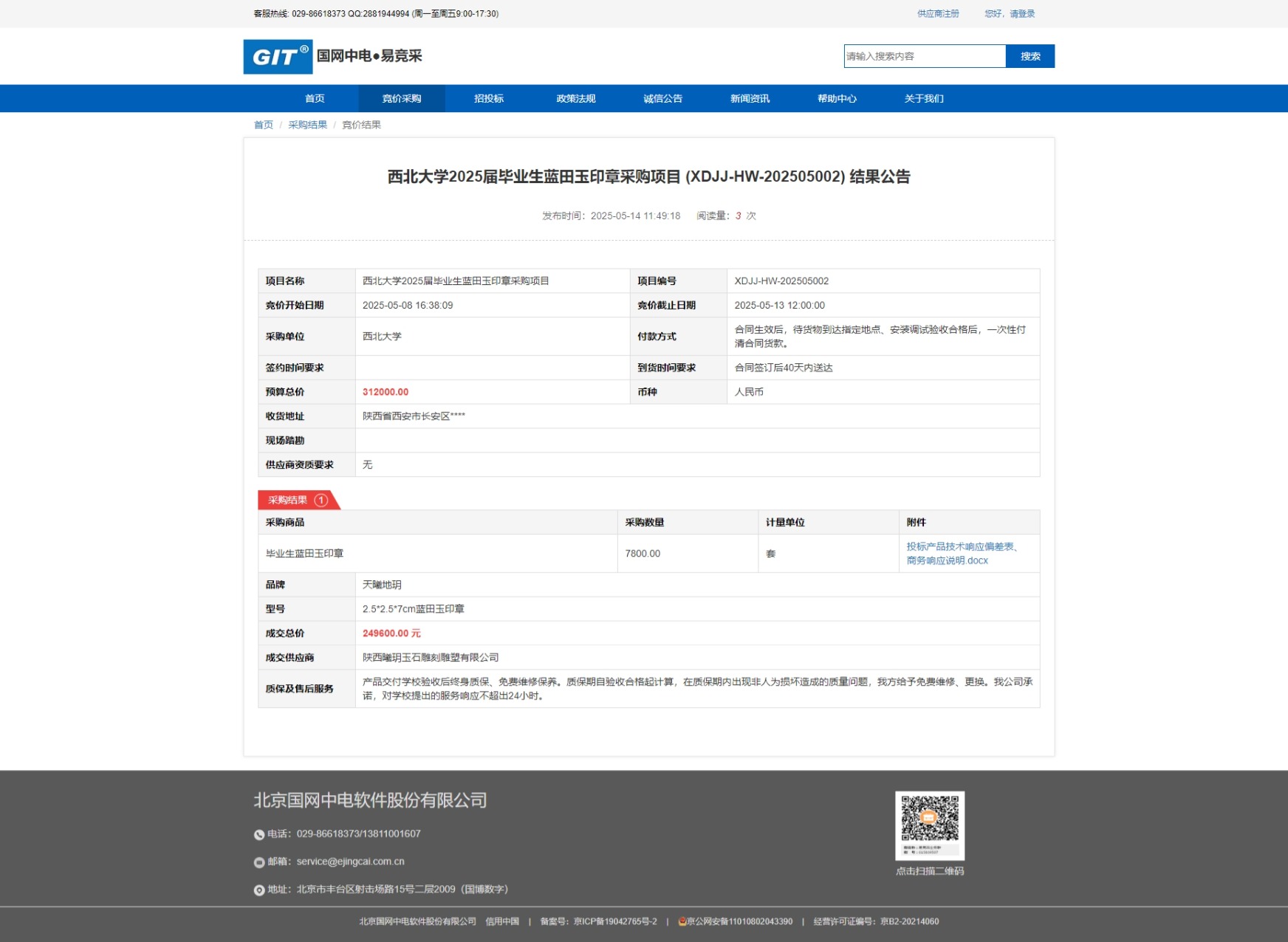 乐竞体育电竞(中国)股份有限公司官网2025届毕业生蓝田玉印章采购项目 (XDJJ-HW-202505002) 竞价结果公告 作者: 编辑:采购与招标办公室 时间:2025-05-14 原公告链接:https://www.ejingcai.com.cn/site/bidding/detail/18215