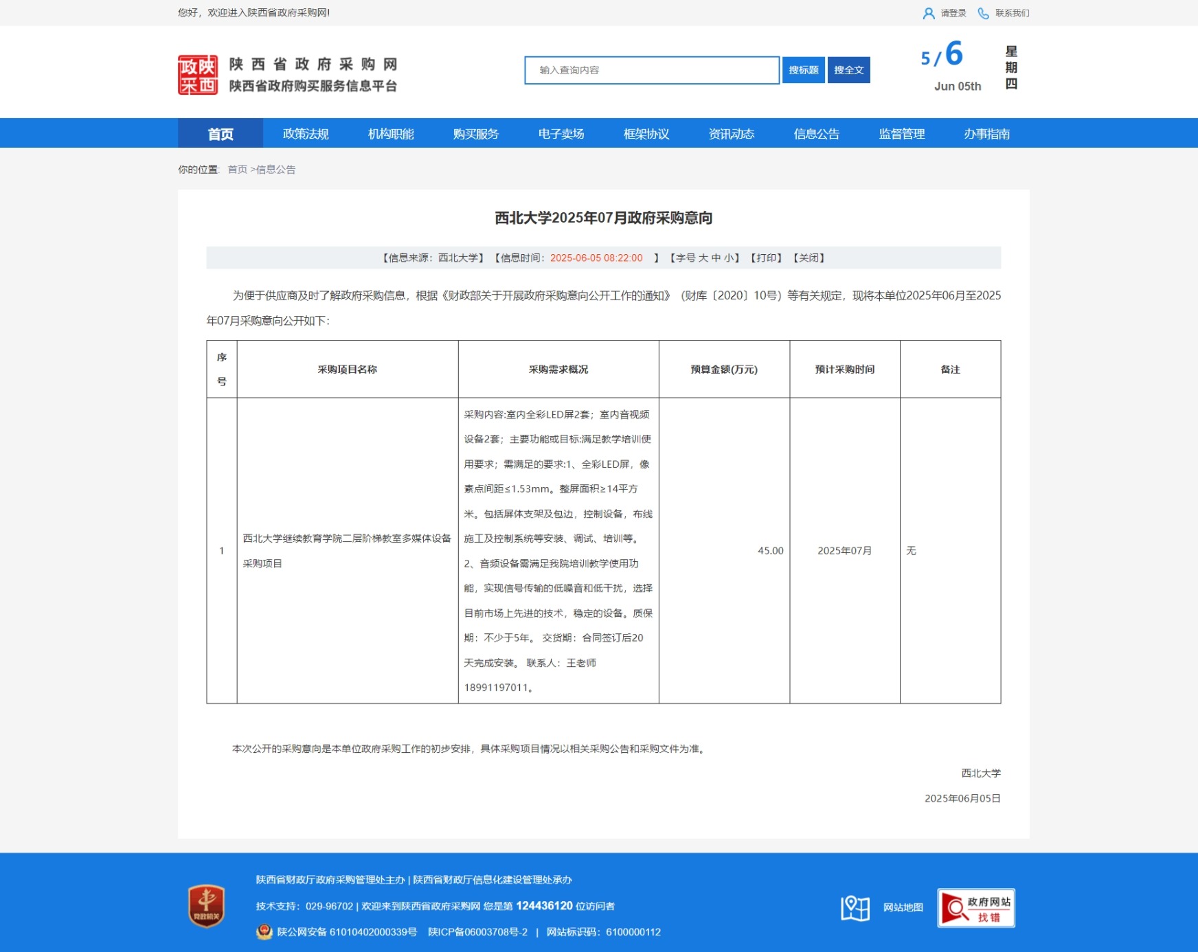 乐竞体育电竞(中国)股份有限公司官网2025年07月政府采购意向 作者: 编辑:采购与招标办公室 时间:2025-06-05 原公告链接:https://www.ccgp-shaanxi.gov.cn/freecms/site/shaanxi/ggxx/info/2025/8a69c8d196ce440a01973d667fcf58b5.html?noticeType=59¬iceId=0a572344-41a5-11f0-8063-08c0eb20c666