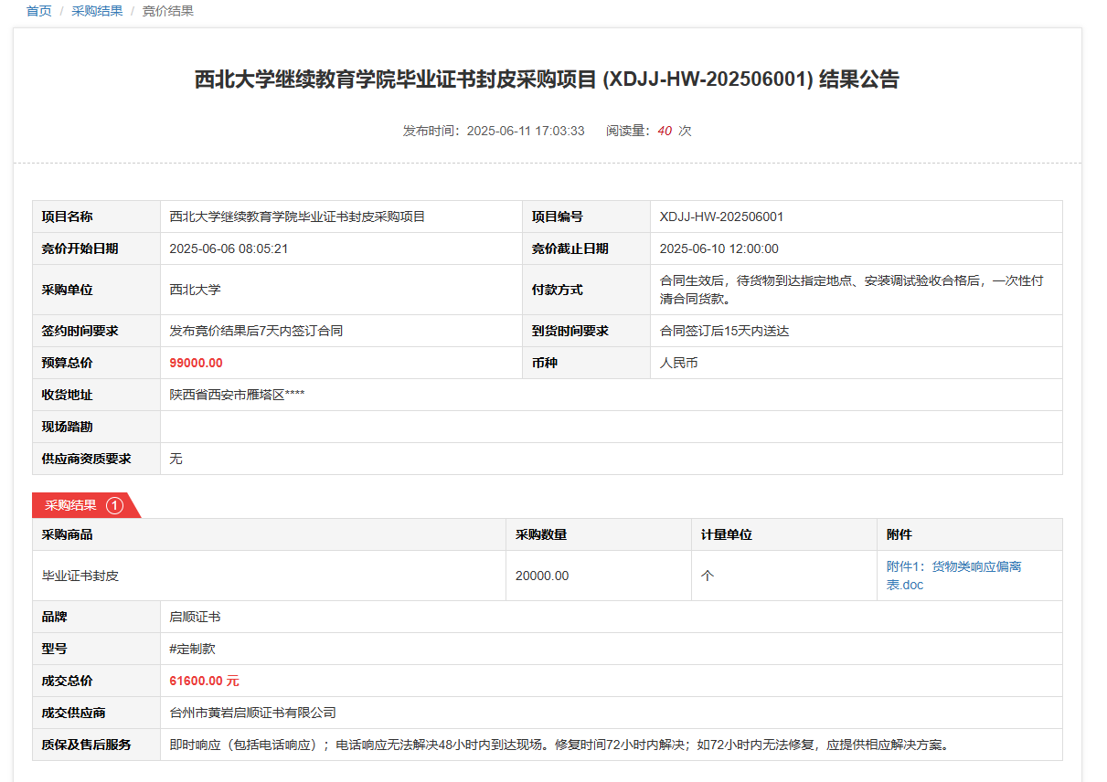 乐竞体育电竞(中国)股份有限公司官网继续教育学院毕业证书封皮采购项目(XDJJ-HW-202506001)竞价结果公告 作者:采购与招标办公室 编辑: 时间:2025-06-12 原公告链接:https://www.ejingcai.com.cn/site/bidding/detail/18846