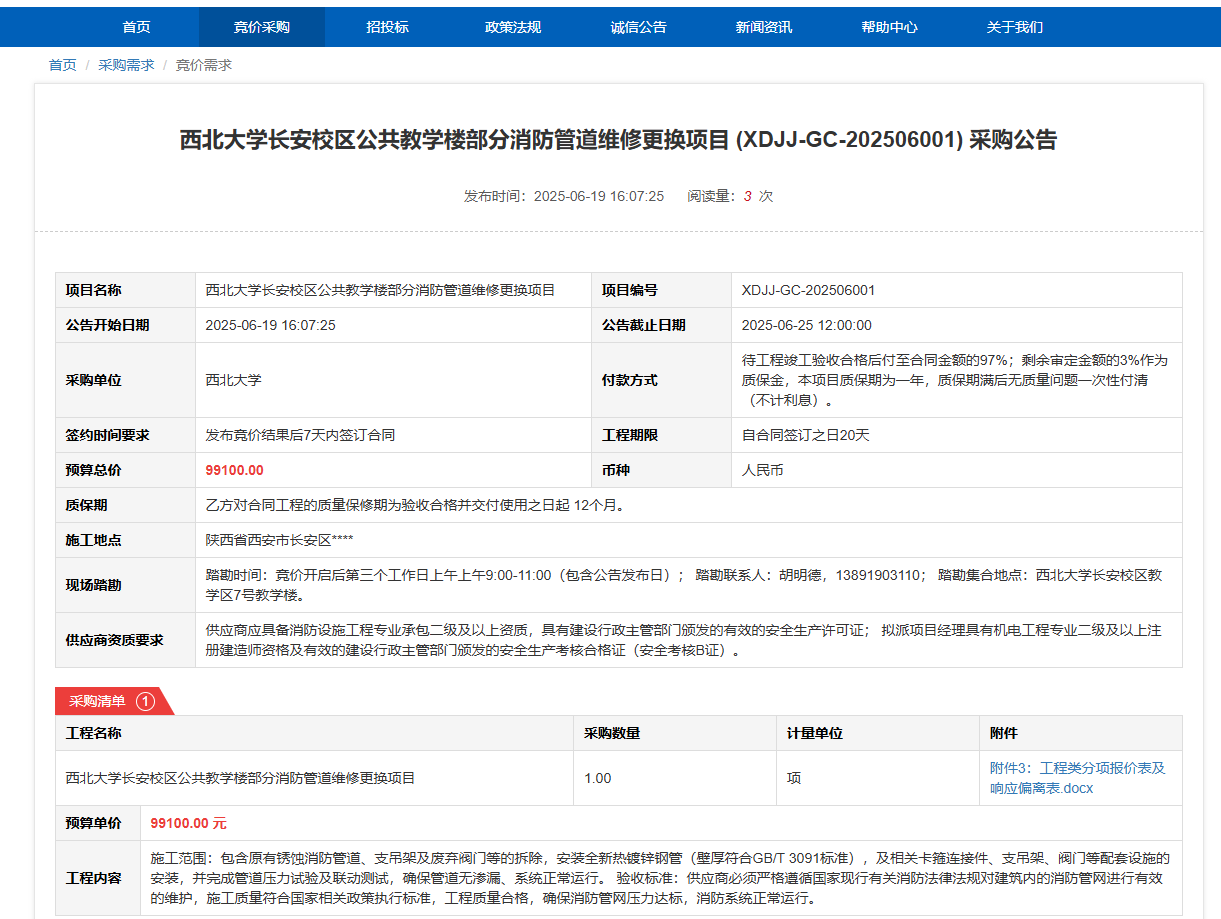 乐竞体育电竞(中国)股份有限公司官网长安校区公共教学楼部分消防管道维修更换项目(XDJJ-GC-202506001)竞价采购公告 作者:采购与招标办公室 编辑: 时间:2025-06-19 原公告链接:https://www.ejingcai.com.cn/site/bidding/detail/19038