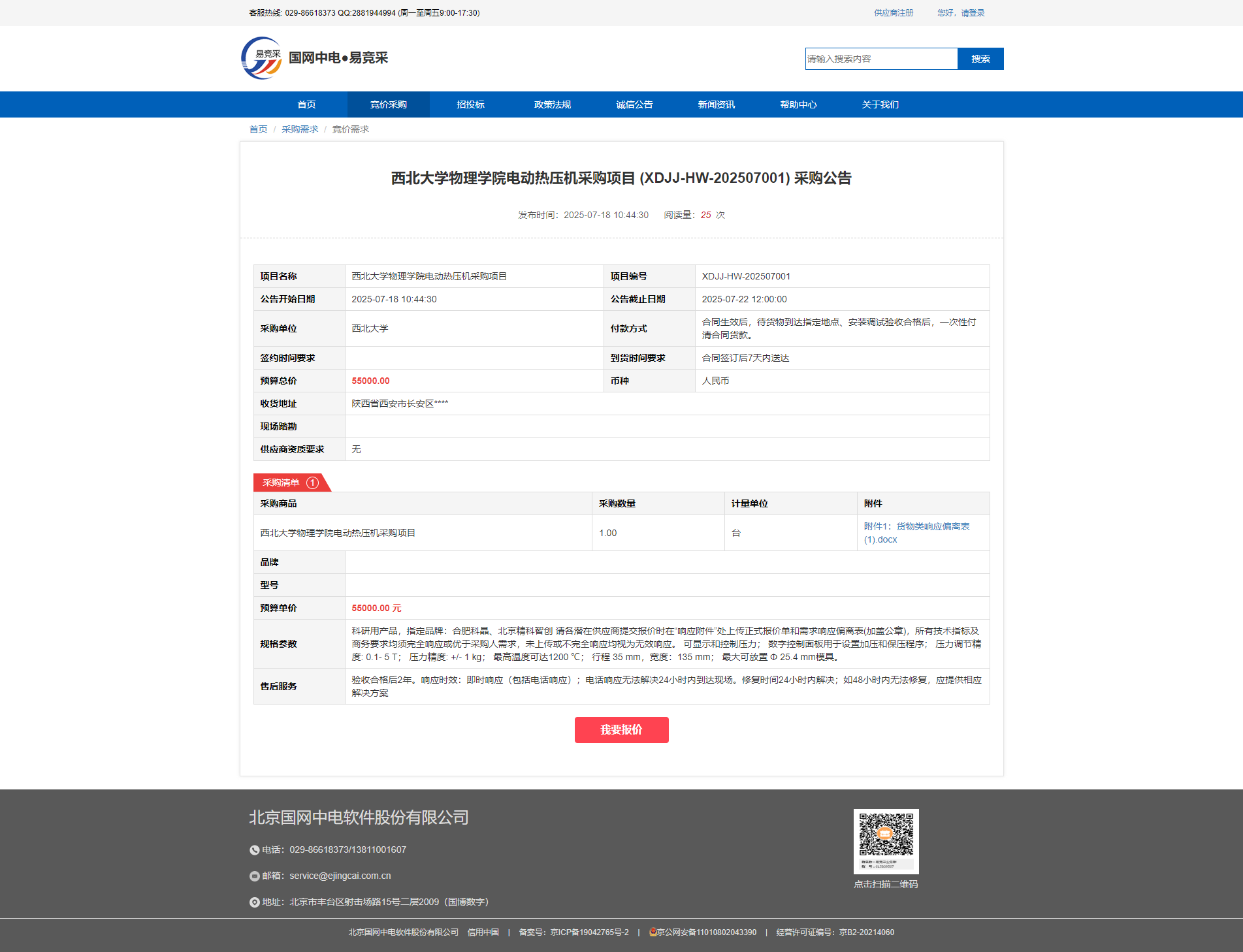 乐竞体育电竞(中国)股份有限公司官网物理学院电动热压机采购项目(XDJJ-HW-202507001)竞价采购公告