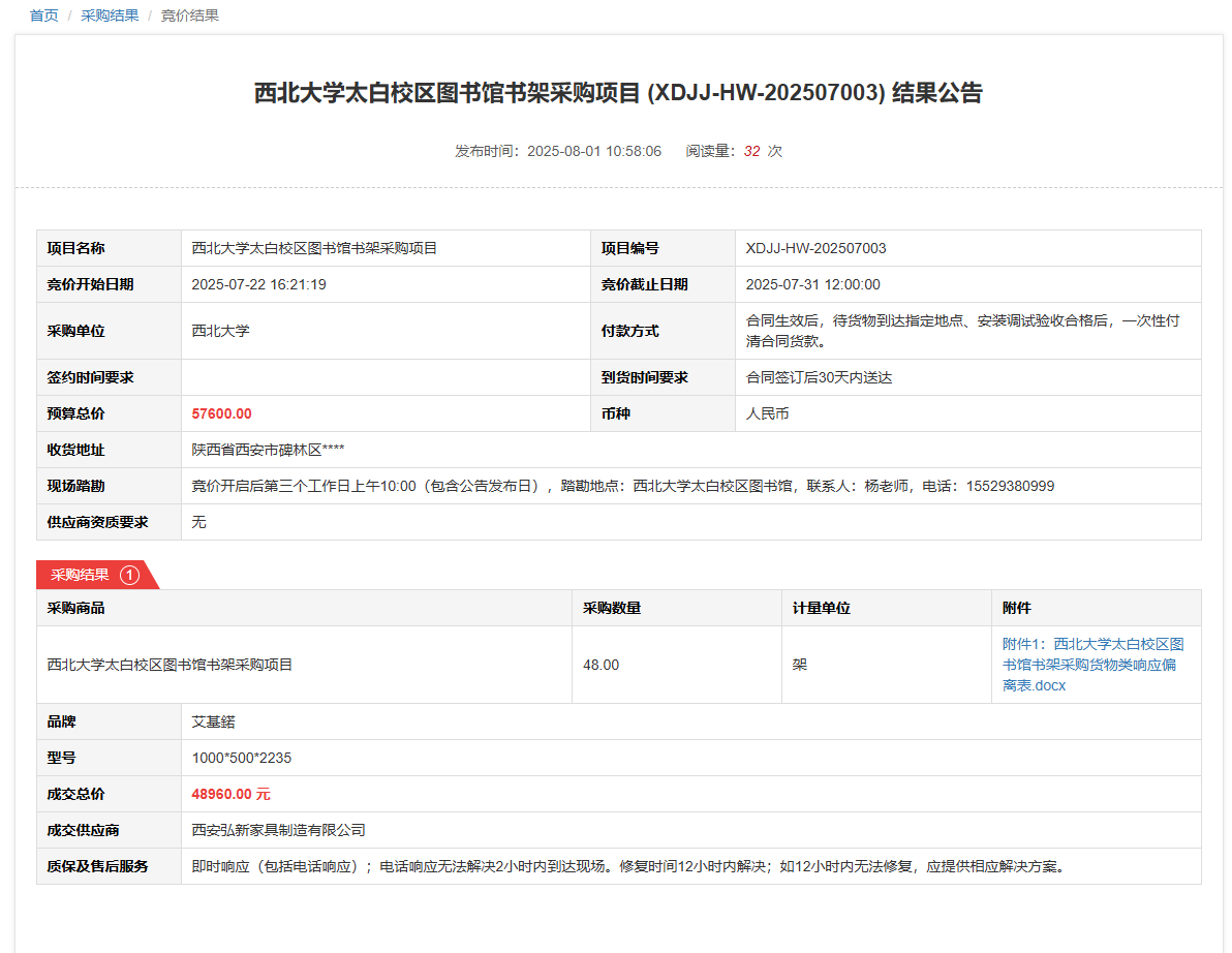 乐竞体育电竞(中国)股份有限公司官网太白校区图书馆阅览桌椅采购项目(XDJJ-HW-202507004)竞价结果公告