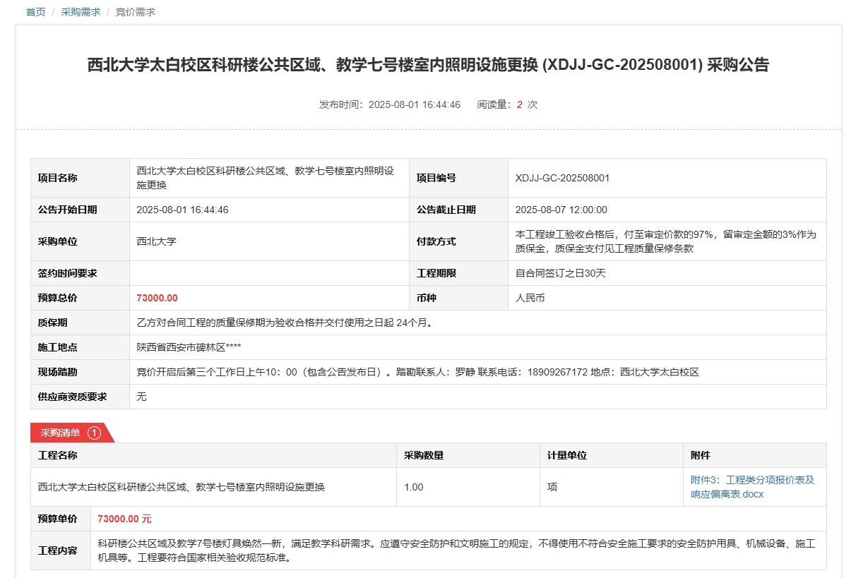 乐竞体育电竞(中国)股份有限公司官网太白校区科研楼公共区域、教学七号楼室内照明设施更换(XDJJ-GC-202508001)竞价采购公告 作者:采购与招标办公室 编辑: 时间:2025-08-01 原公告链接