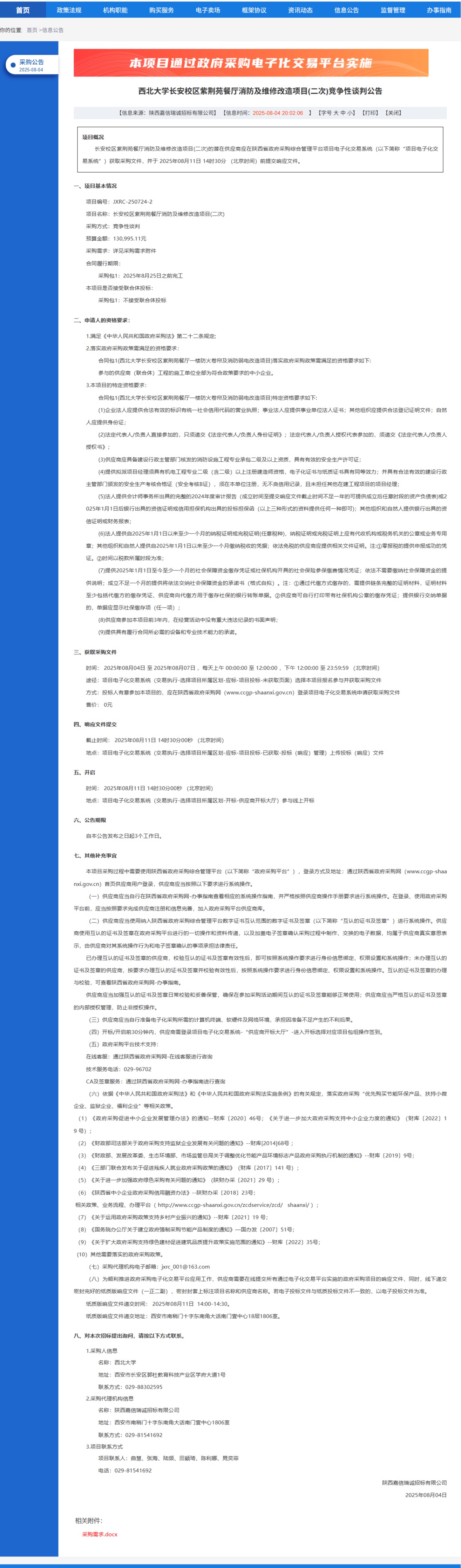 乐竞体育电竞(中国)股份有限公司官网长安校区紫荆苑餐厅消防及维修改造项目(二次)竞争性谈判公告 作者: 编辑:党丹珩 时间:2025-08-04 公告地址:https://www.ccgp-shaanxi.gov.cn/freecms/site/shaanxi/ggxx/info/2025/8a69c1e29860ef6f019874c6b4a22713.html?noticeType=001013¬iceId=e37c65dc-712c-11f0-8063-08c0eb20c666