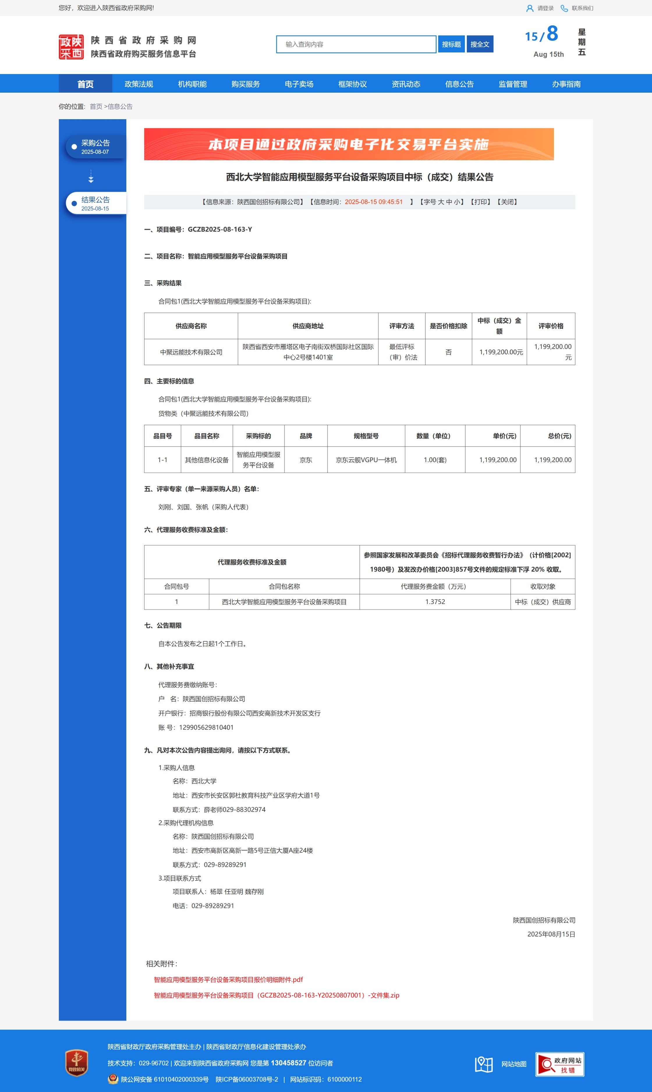 乐竞体育电竞(中国)股份有限公司官网智能应用模型服务平台设备采购项目中标(成交)结果公告 作者: 编辑:采购与招标办公室 时间:2025-08-15 原公告链接:https://www.ccgp-shaanxi.gov.cn/freecms/site/shaanxi/ggxx/info/2025/8a69c4d59860f6420198ab5332c37fcf.html?noticeType=001023¬iceId=a3a64a26-797b-11f0-8063-08c0eb20c666