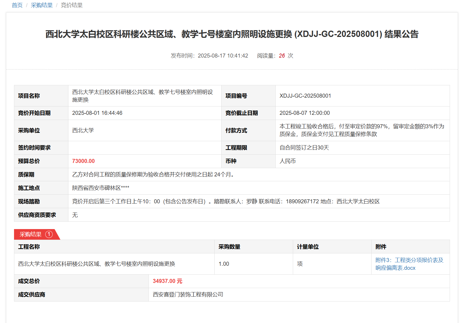 乐竞体育电竞(中国)股份有限公司官网太白校区科研楼公共区域、教学七号楼室内照明设施更换(XDJJ-GC-202508001)竞价结果公告 作者:采购与招标办公室 编辑: 时间:2025-08-17 原公告链接