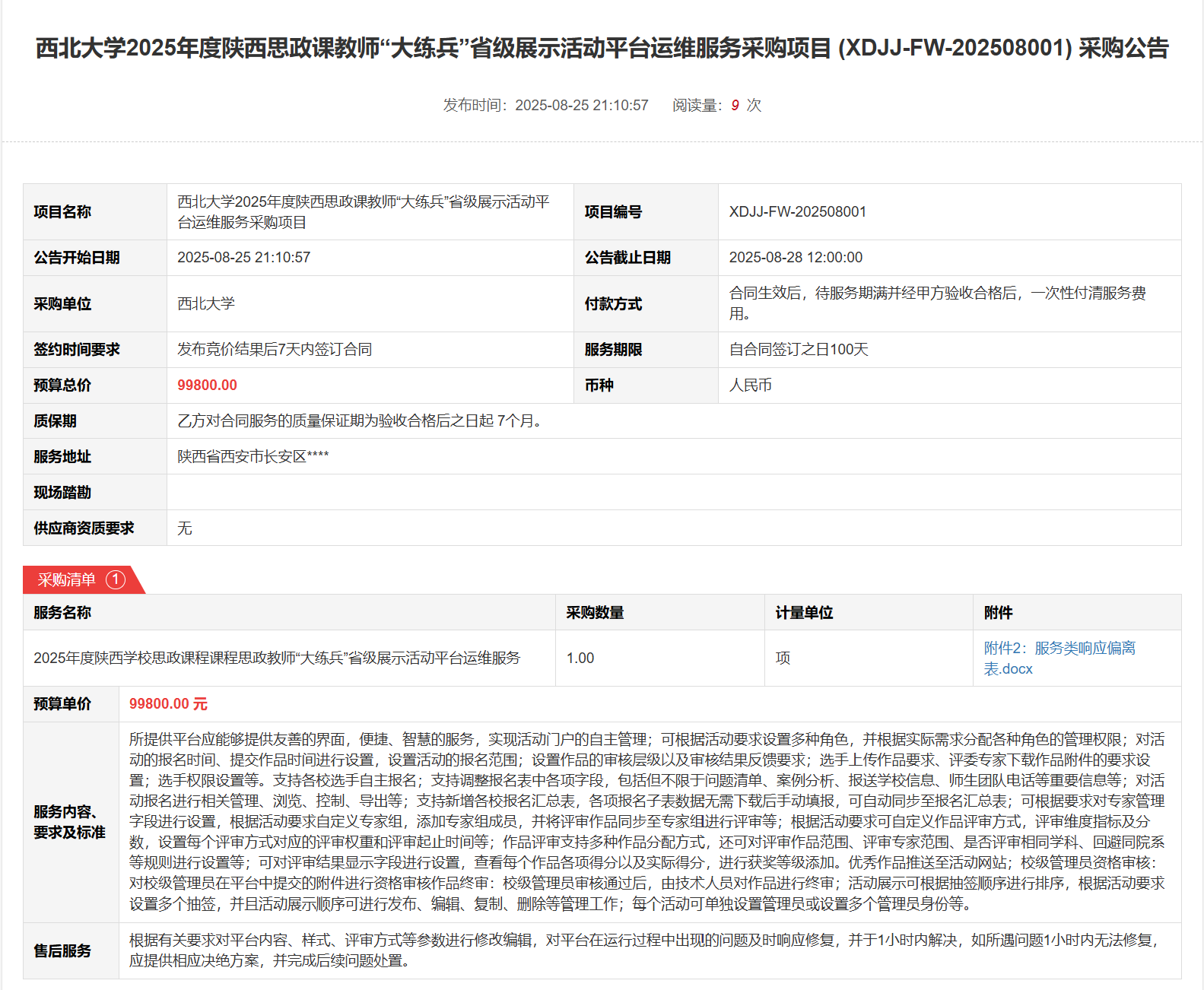 乐竞体育电竞(中国)股份有限公司官网2025年度陕西思政课教师“大练兵”省级展示活动平台运维服务采购项目(XDJJ-FW-202508001)竞价采购公告 作者:采购与招标办公室 编辑: 时间:2025-08-25 原公告链接