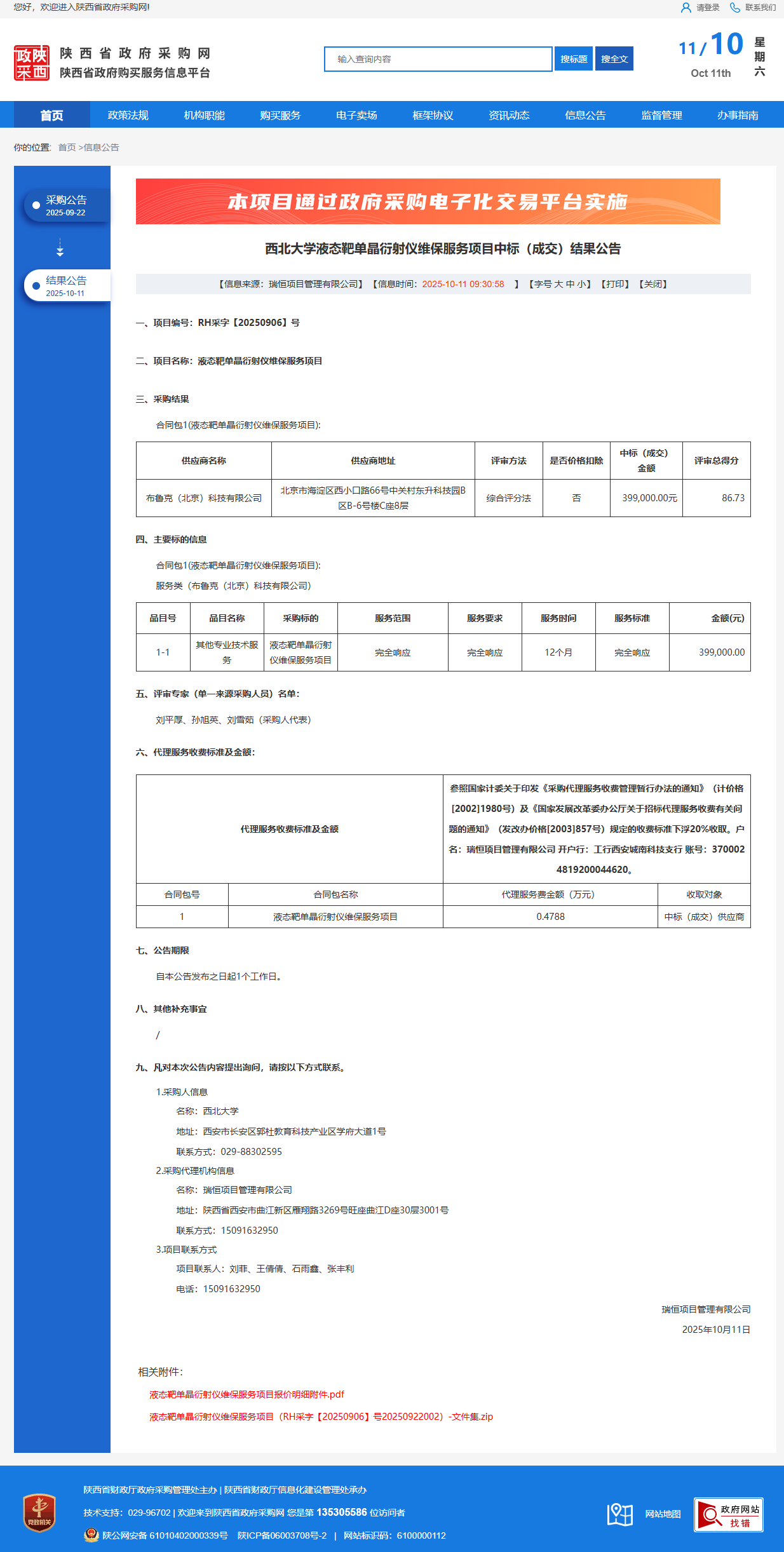 乐竞体育电竞(中国)股份有限公司官网液态靶单晶衍射仪维保服务项目中标(成交)结果公告