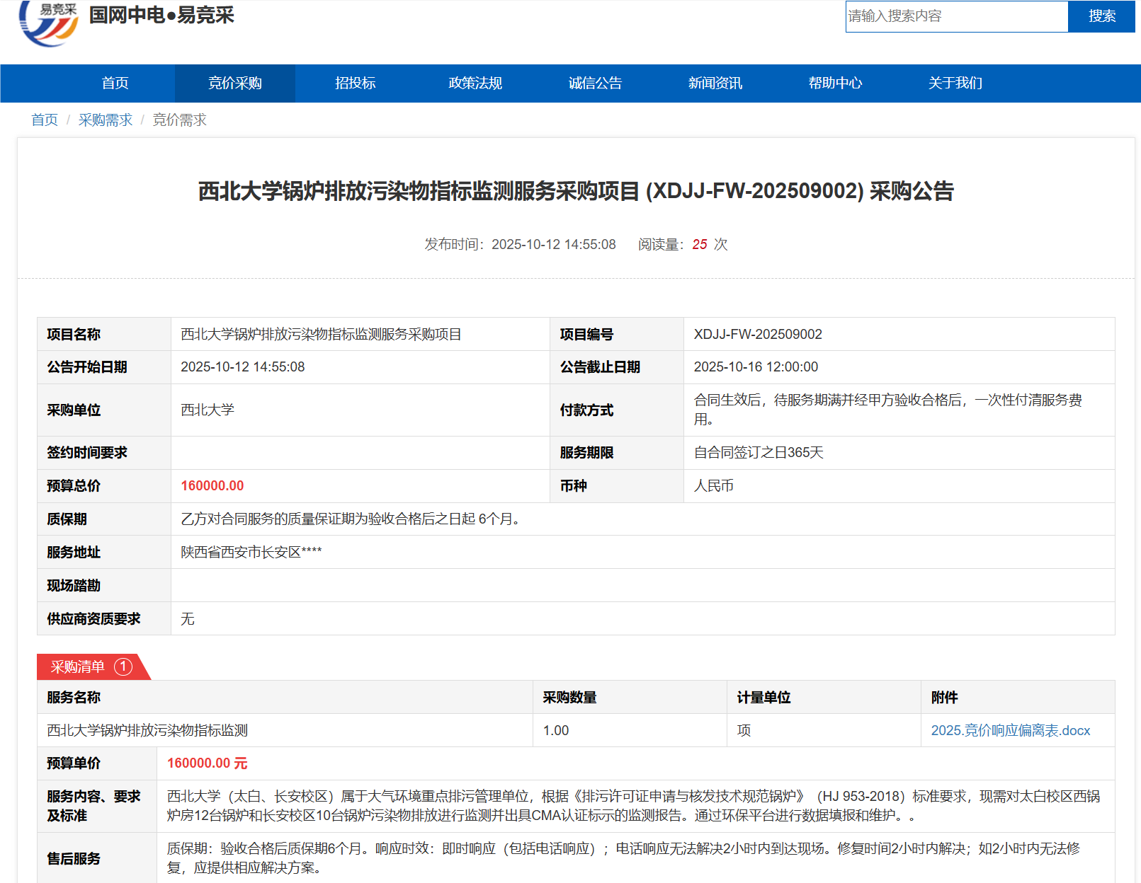 乐竞体育电竞(中国)股份有限公司官网锅炉排放污染物指标监测服务采购项目(XDJJ-FW-202509002)竞价采购公告