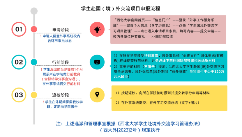 4.申请学生在确定录取后,应及时履行出国(境)前相关行前手续。请务了解有关本项目学生的申请、行前、返校阶段情况说明,请见下图说明。