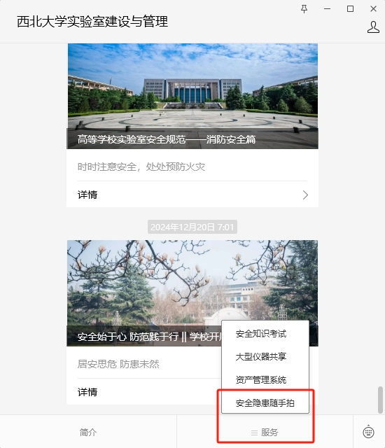 (1)关注“乐竞体育电竞(中国)股份有限公司官网实验室建设与管理”微信公众号,选择“服务”—“安全隐患随手拍”,填写个人信息、隐患描述等,并上传隐患照片。
