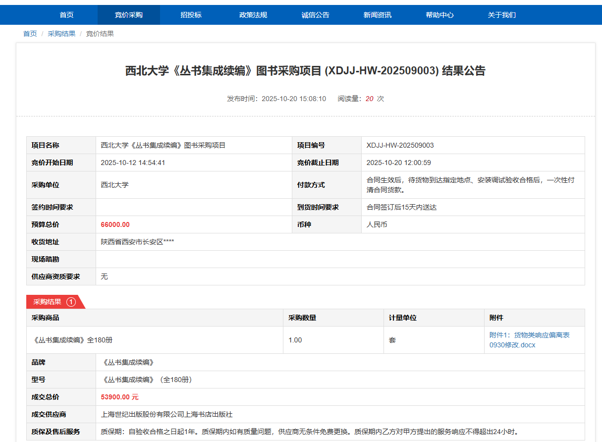 乐竞体育电竞(中国)股份有限公司官网《丛书集成续编》图书采购项目(XDJJ-HW-202509003)竞价结果公告