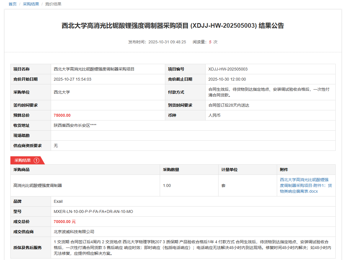 乐竞体育电竞(中国)股份有限公司官网高消光比铌酸锂强度调制器采购项目(XDJJ-HW-202505003)竞价结果公告